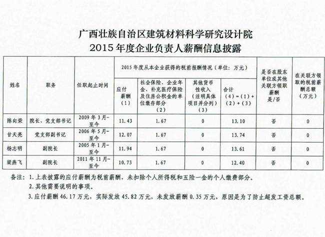 廣西壯族自治區建筑材料科學研究設計院2015年度企業負責人薪酬信息披露