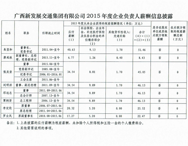 廣西新發展交通集團有限公司2015年度企業負責人薪酬信息披露
