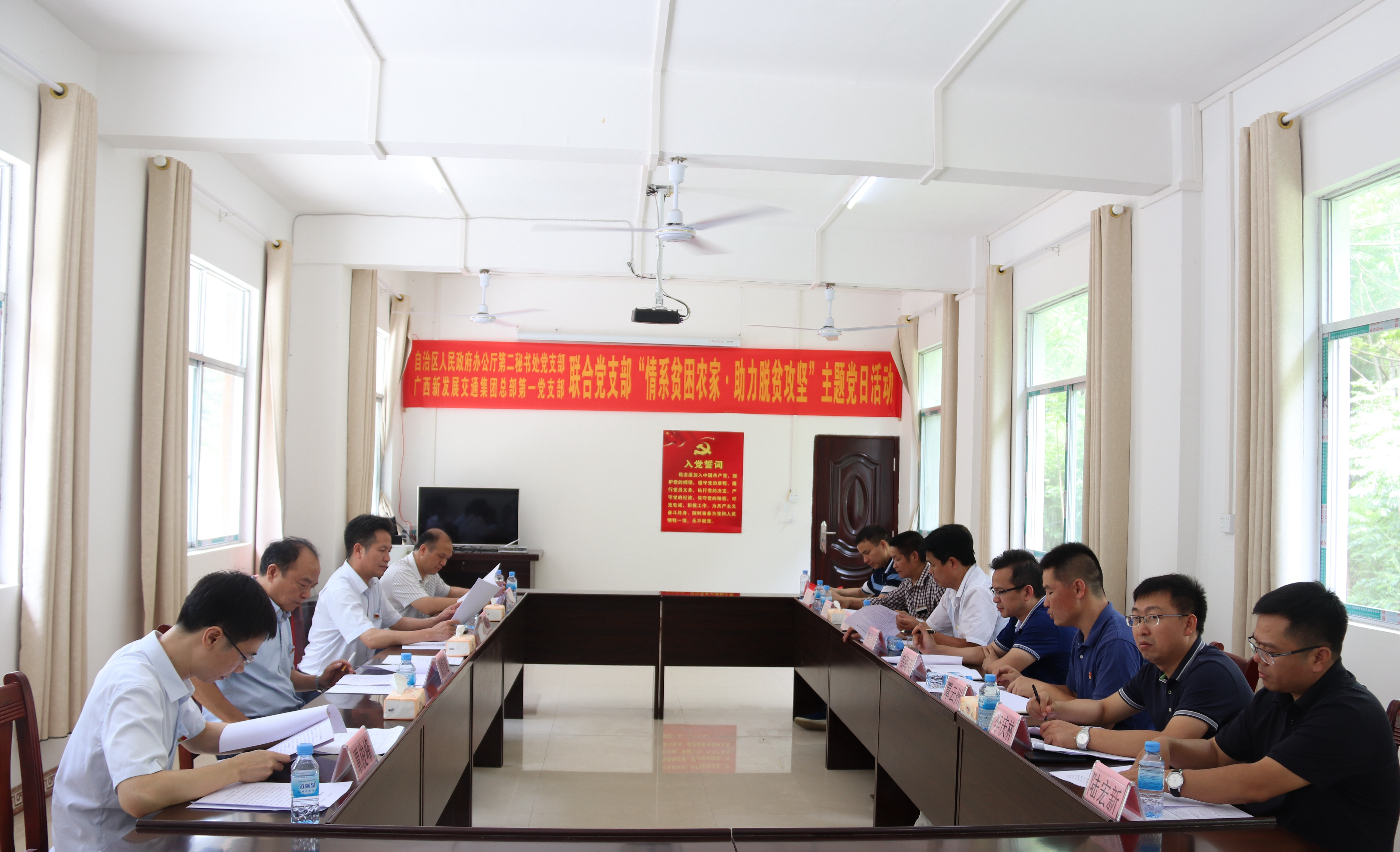 在座談會上,雅龍鄉(xiāng)紅日村第一書記覃云州介紹了紅日村的基本情況。黃植建著重強調(diào)當(dāng)?shù)卣e極說服貧困戶轉(zhuǎn)變封建固守的思想,鼓勵他們走出大山,到外地就業(yè),用自己的雙手努力改善家庭的生活條件,早日實現(xiàn)脫貧。朱堅和表示,紅日當(dāng)頭,自強不息,廣西新發(fā)展交通集團(tuán)將會大力扶持當(dāng)?shù)刎毨簦谛迾蛑返耐瑫r,幫助項目沿線群眾盡快脫貧,早日奔向小康。會末,黨員同志們一起重溫了入黨誓詞。